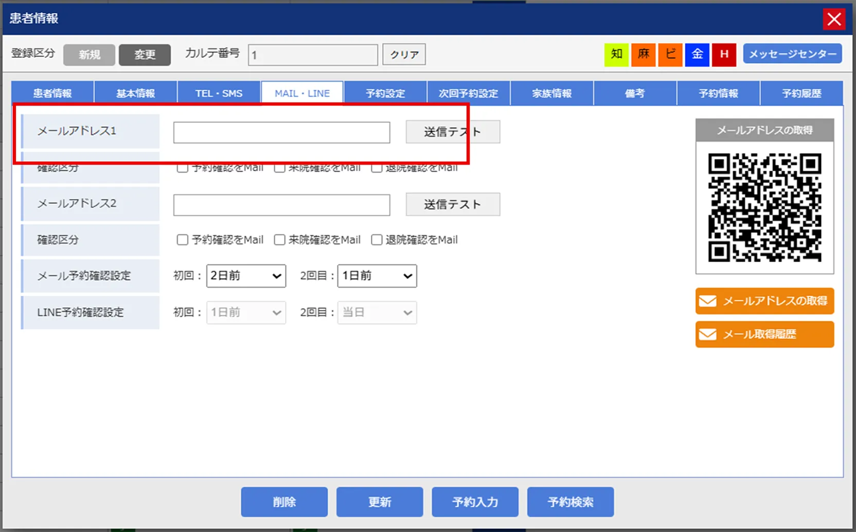 1.患者情報のMAILタブ内に手入力、もしくはQRコードを利用して患者様のメールアドレスを取得してください。
