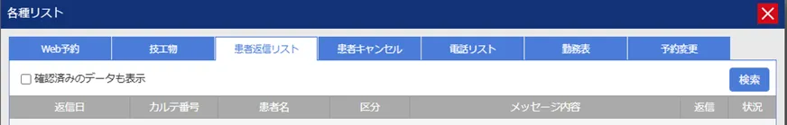 各種リストの患者返信リストにて患者さんからの返信が確認できます。