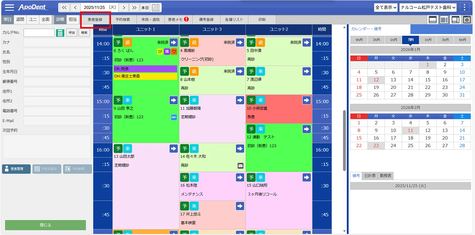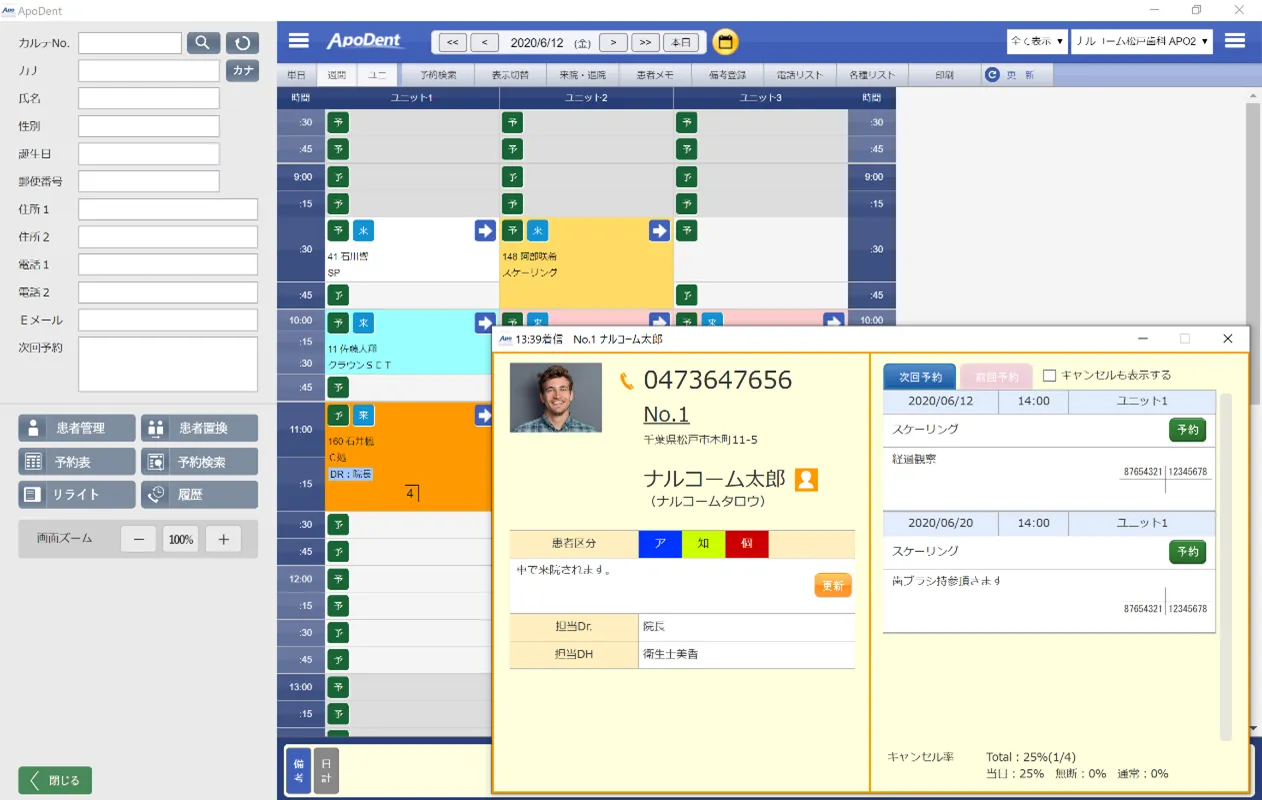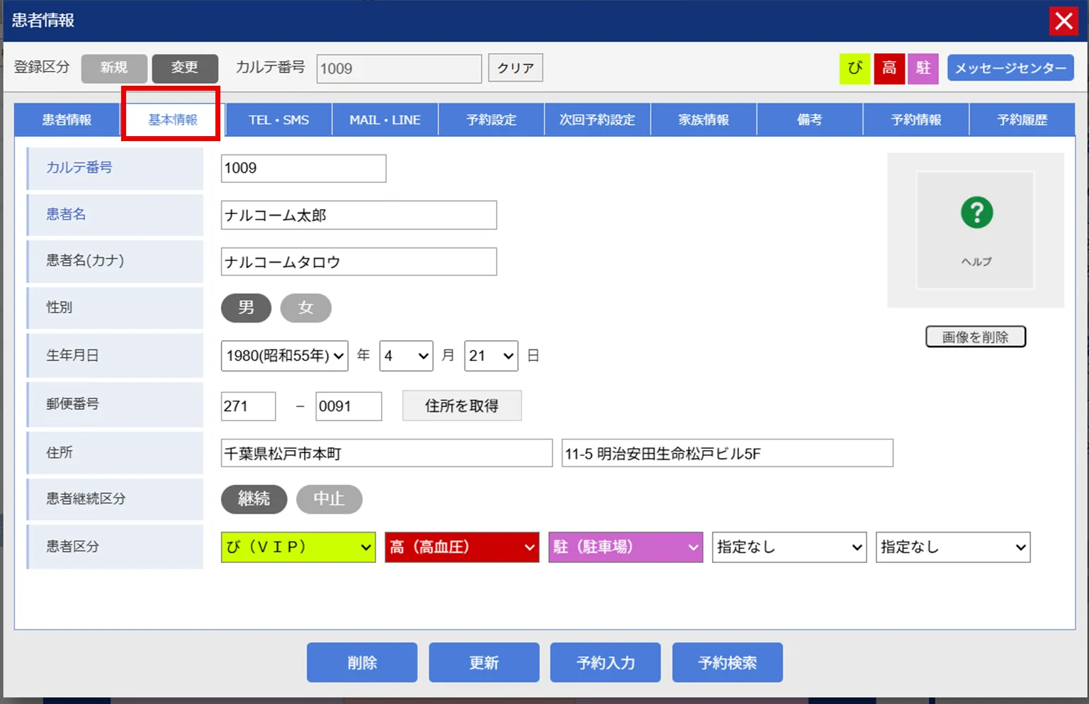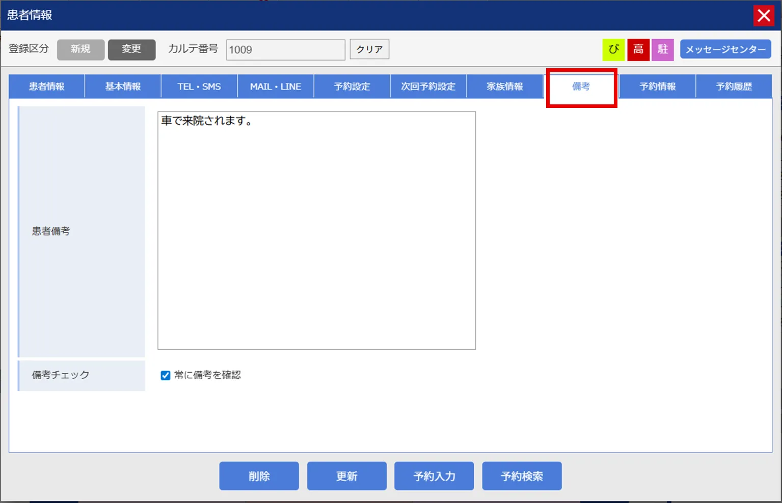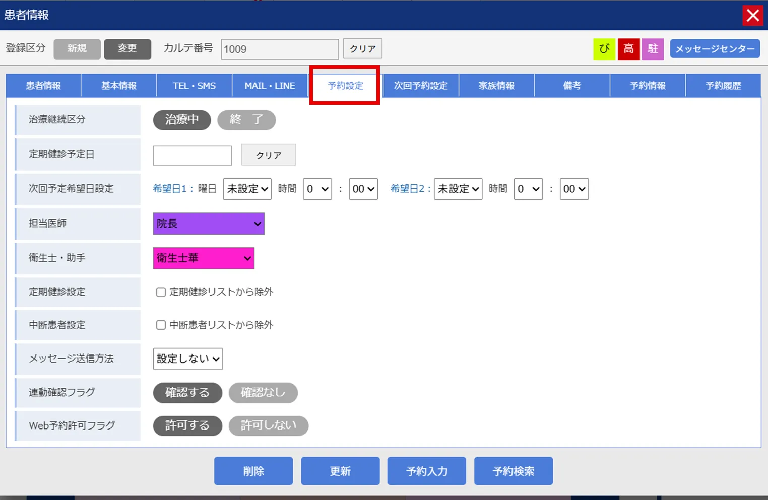 予約情報・患者情報に登録されている内容が表示されます。お名前以外に患者備考や患者区分、担当Dr.(DH)の登録ができるのでご活用いただくことでより良い電話対応に繋がります。