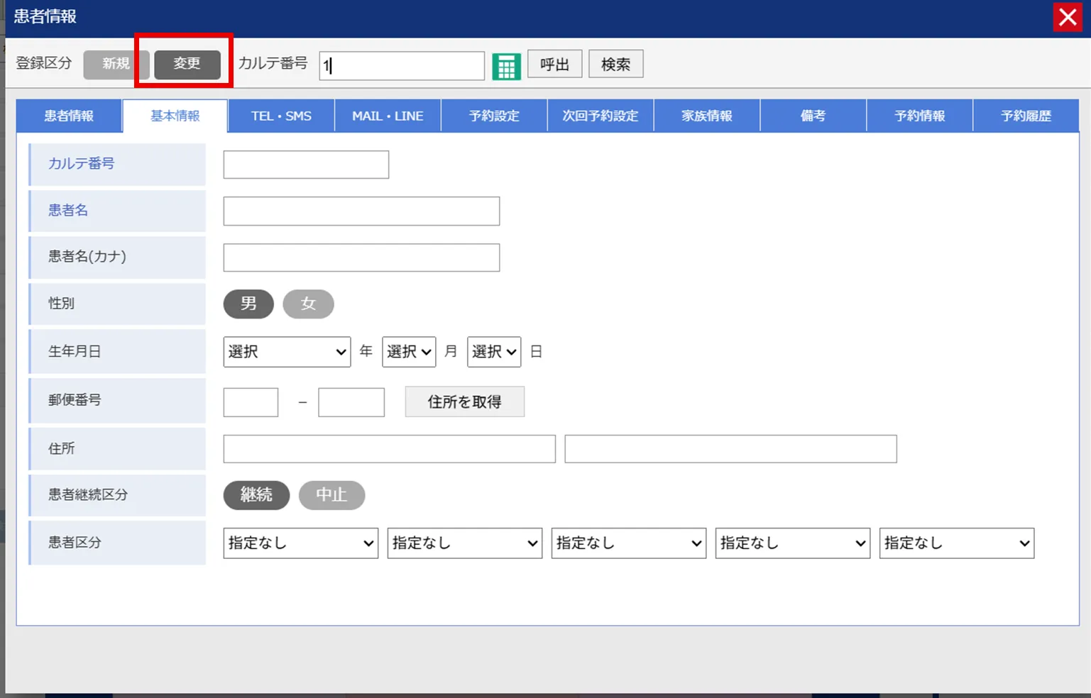 2.変更にし、カルテ番号もしくは名前検索をして患者さんを指定してください。