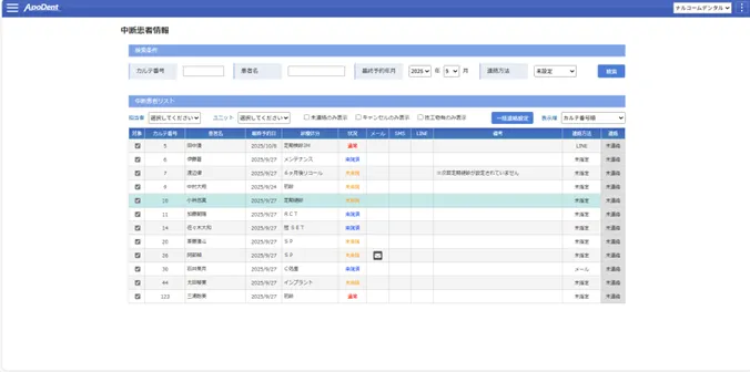 - 可能です。治療を中断している患者さん(先の予約を取っていない方)をリストアップする機能があります。キャンセルで来院されなくなってしまった患者さんのみを検索し、個別や一括でメッセージを送信する機能もございます。