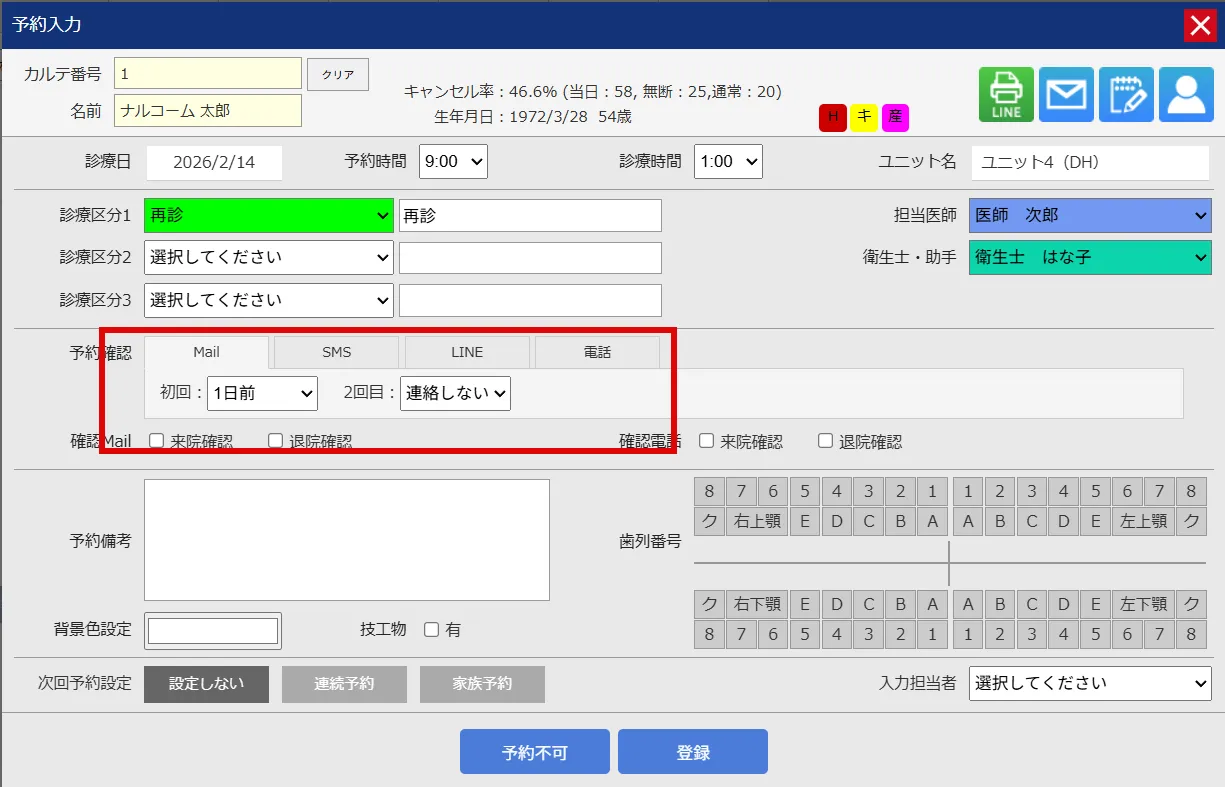 - リマインドメッセージを送信することで、うっかり忘れは確実に減らすことができます。Eメールでのメッセージ送信を基本機能として備えておりますが、より開封率の高いLINEやSMSでの送信もオプション機能としてご準備しております。医院様の患者様の年齢層や、設定したい内容に合わせてご検討ください。