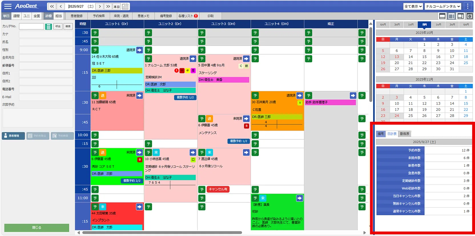 - 日計表や統計情報機能から簡単にご確認いただけます。アポデントをご活用いただくことで、来院人数、キャンセル人数、急患人数、新患人数、健診人数などを様々な情報を簡単に集計することができます。